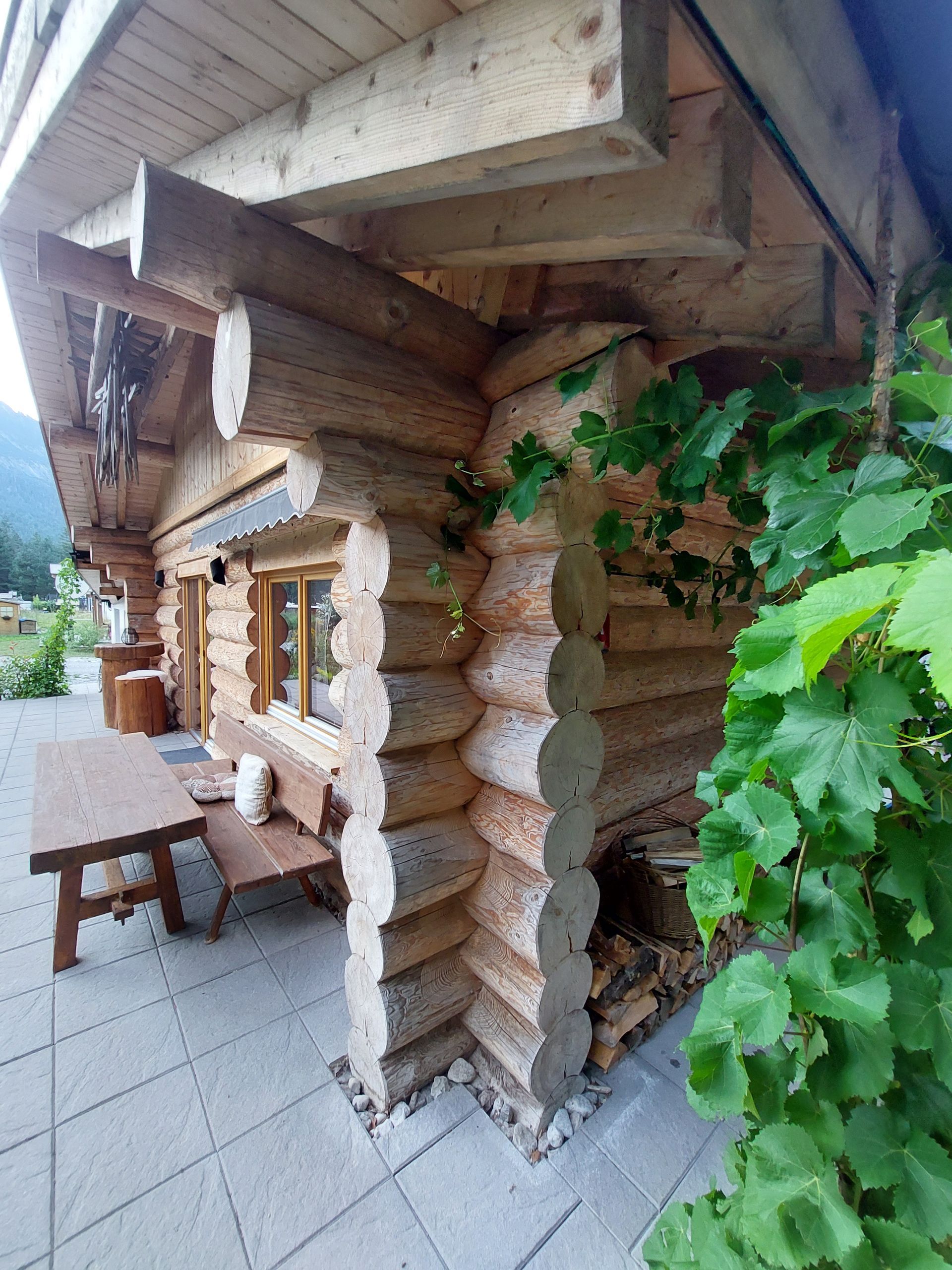 Im kanadischen Blockhausstil errichtet, gefertigt aus naturbelassenen, wintergeschlagenen Fichtenbaumstämmen, mit Schafwolle isoliert.