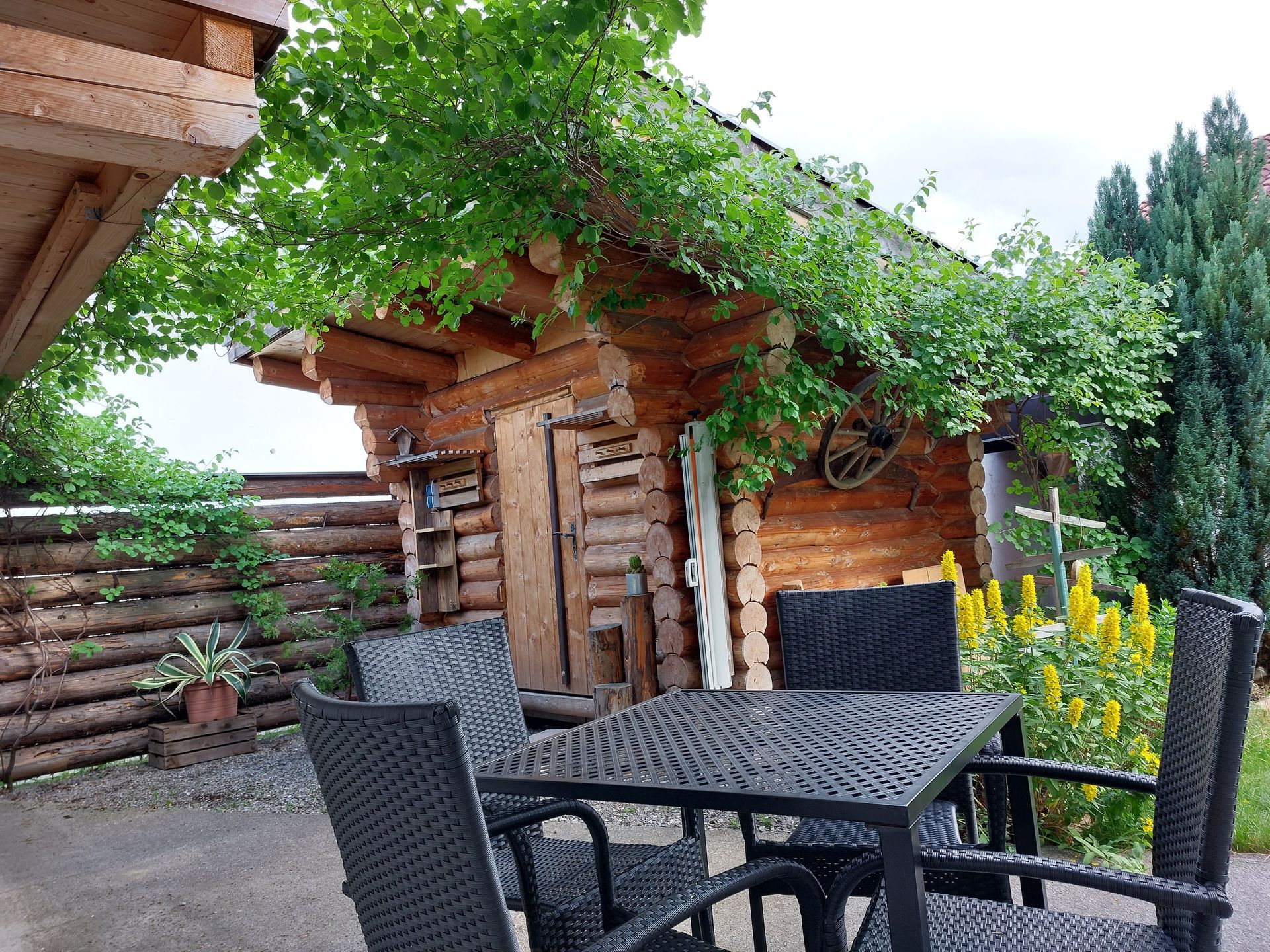 В доме для отпуска имеется терраса на южной стороне с прямым выходом в сад с принадлежностями для барбекю и бревенчатой сауной.